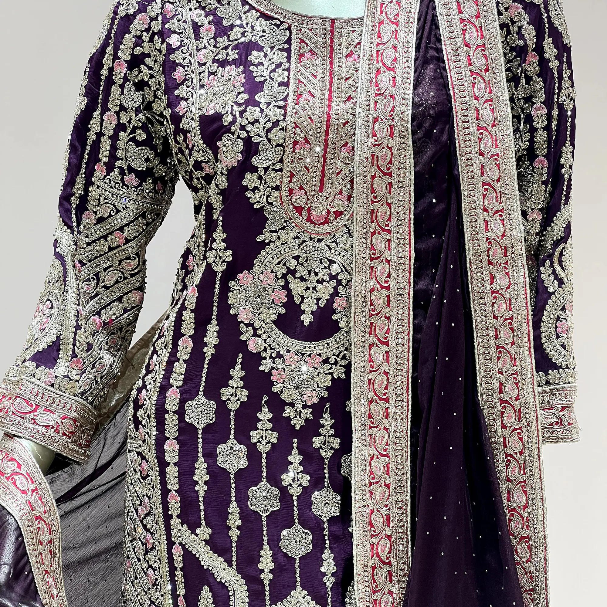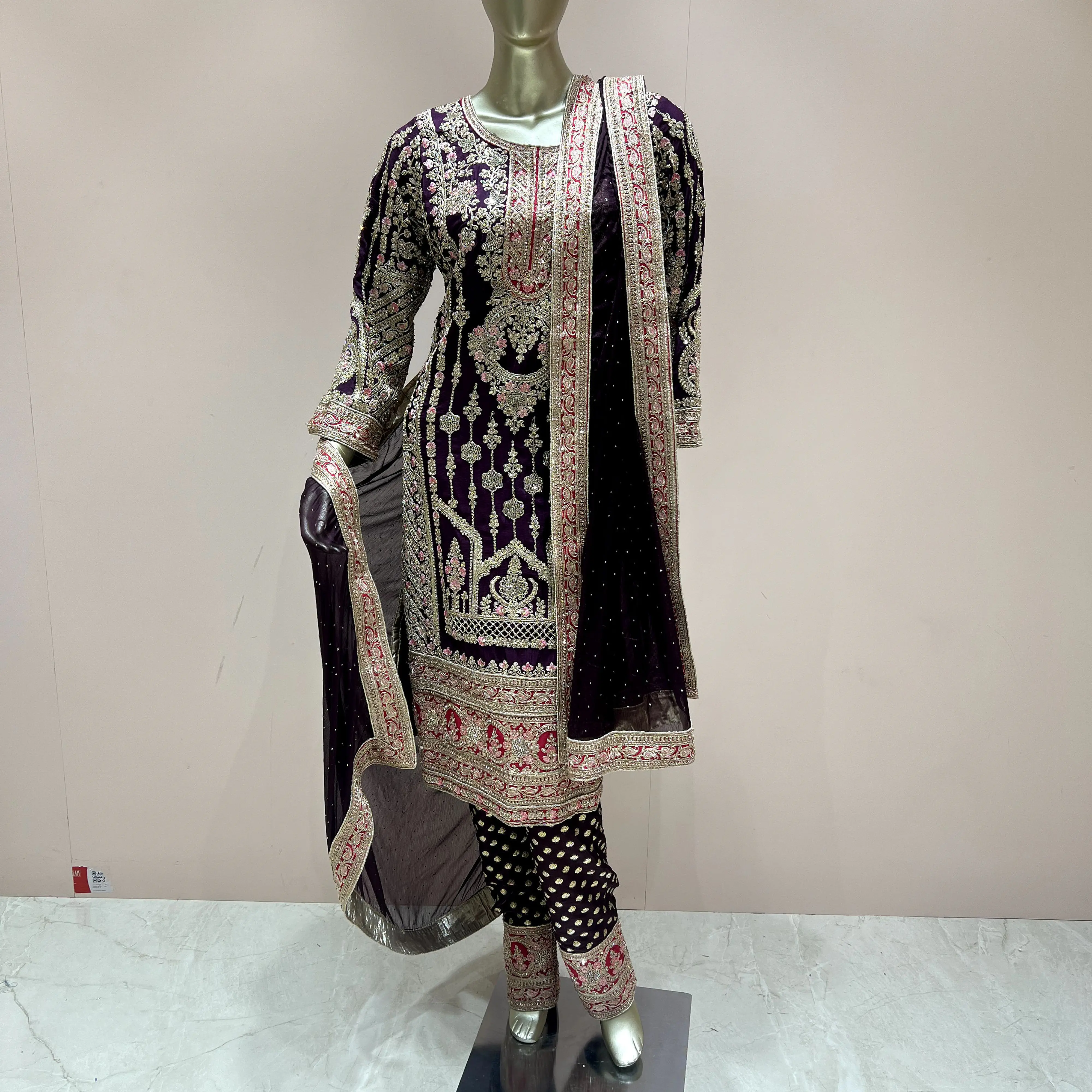 Grace meets tradition in this stylish straight-cut shirt and pant set. Made from luxurious chinon fabric with a rich Banaras georgette dupatta, this set offers a perfect blend of comfort and festive elegance. Ideal for celebrations or evening outings.