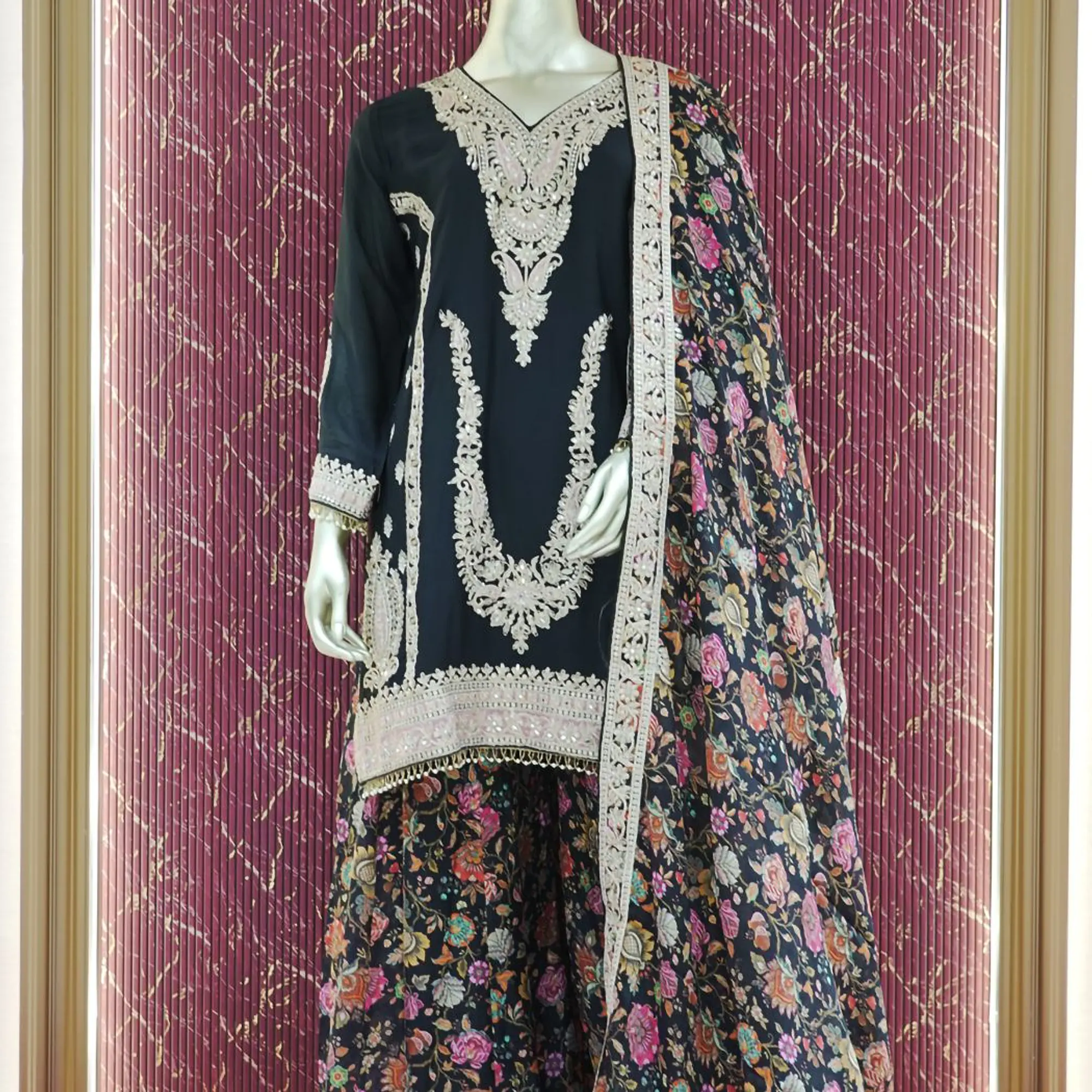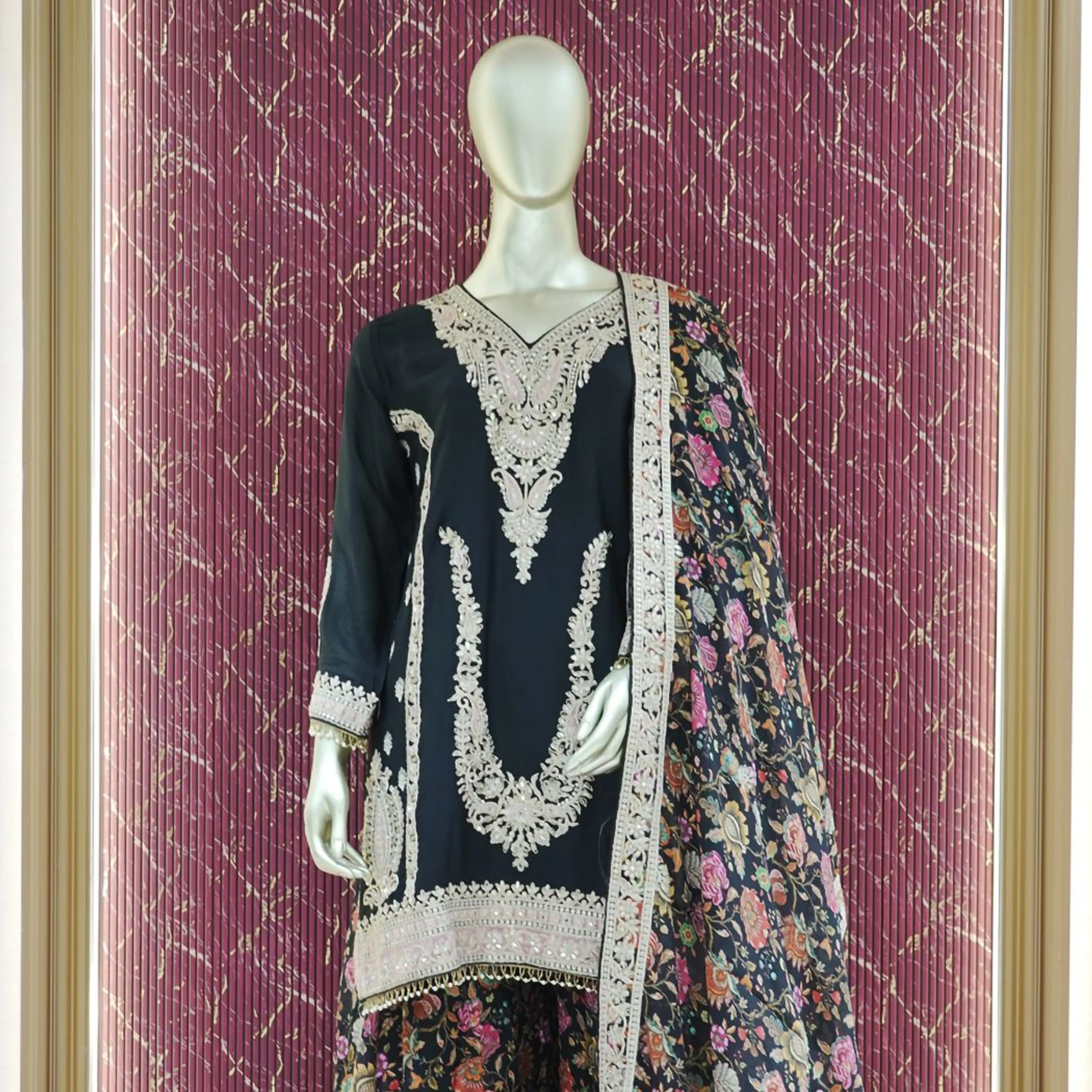 This elegant deep black chinnon kurta features exquisite ivory embroidery that strikes a perfect balance between delicate detail and bold design. Paired with flowy floral printed palazzo bottoms and a matching dupatta, this lightweight ensemble showcases a harmonious blend of traditional artistry and modern grace. Made from premium soft and breathable chinnon fabric, it offers a fluid drape and effortless comfort—ideal for festive occasions, intimate celebrations, or elegant evenings.