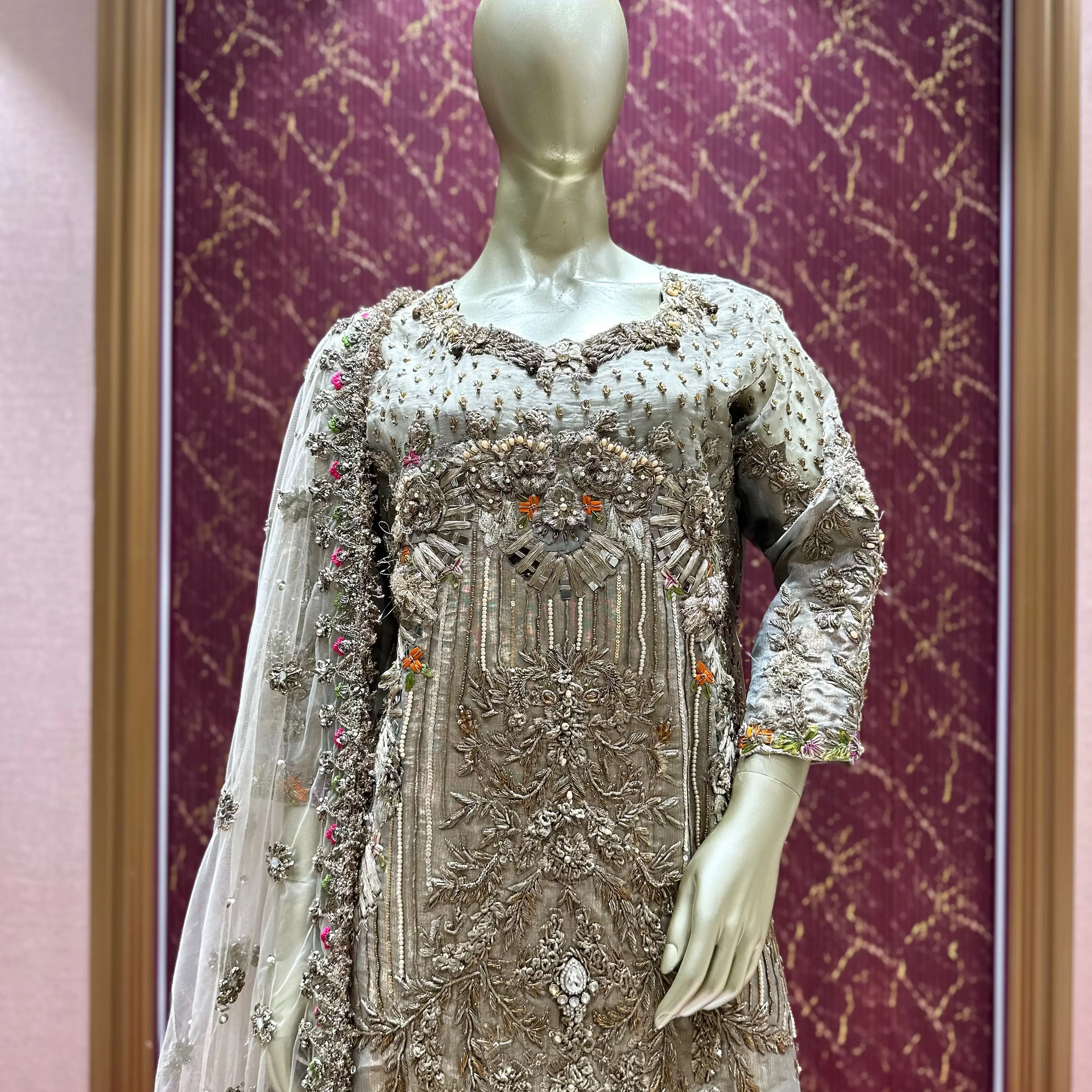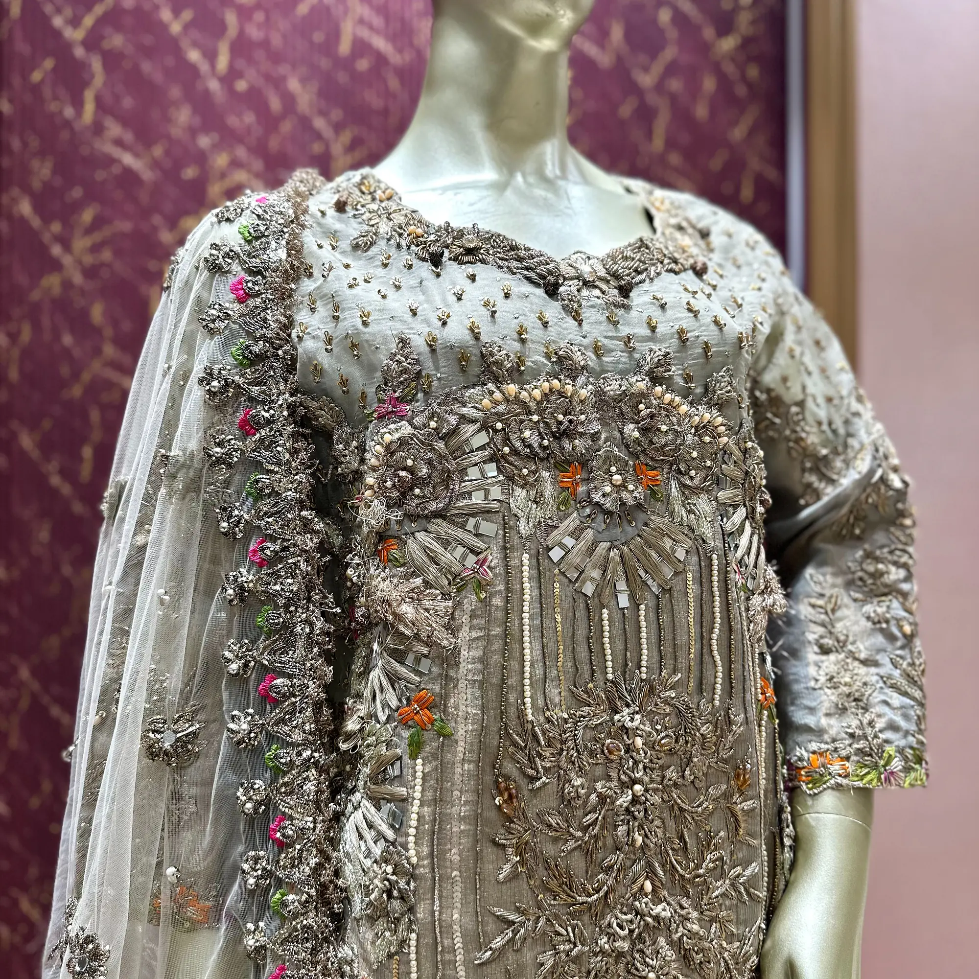 Make an unforgettable impression with this refined Khudabaksh designer palazzo set. The shimmering tissue top and crushed tissue bottom offer a graceful flow and subtle shine, while the lightweight net dupatta adds a soft, airy finish. A perfect blend of tradition and modern elegance, tailored for special occasions.
