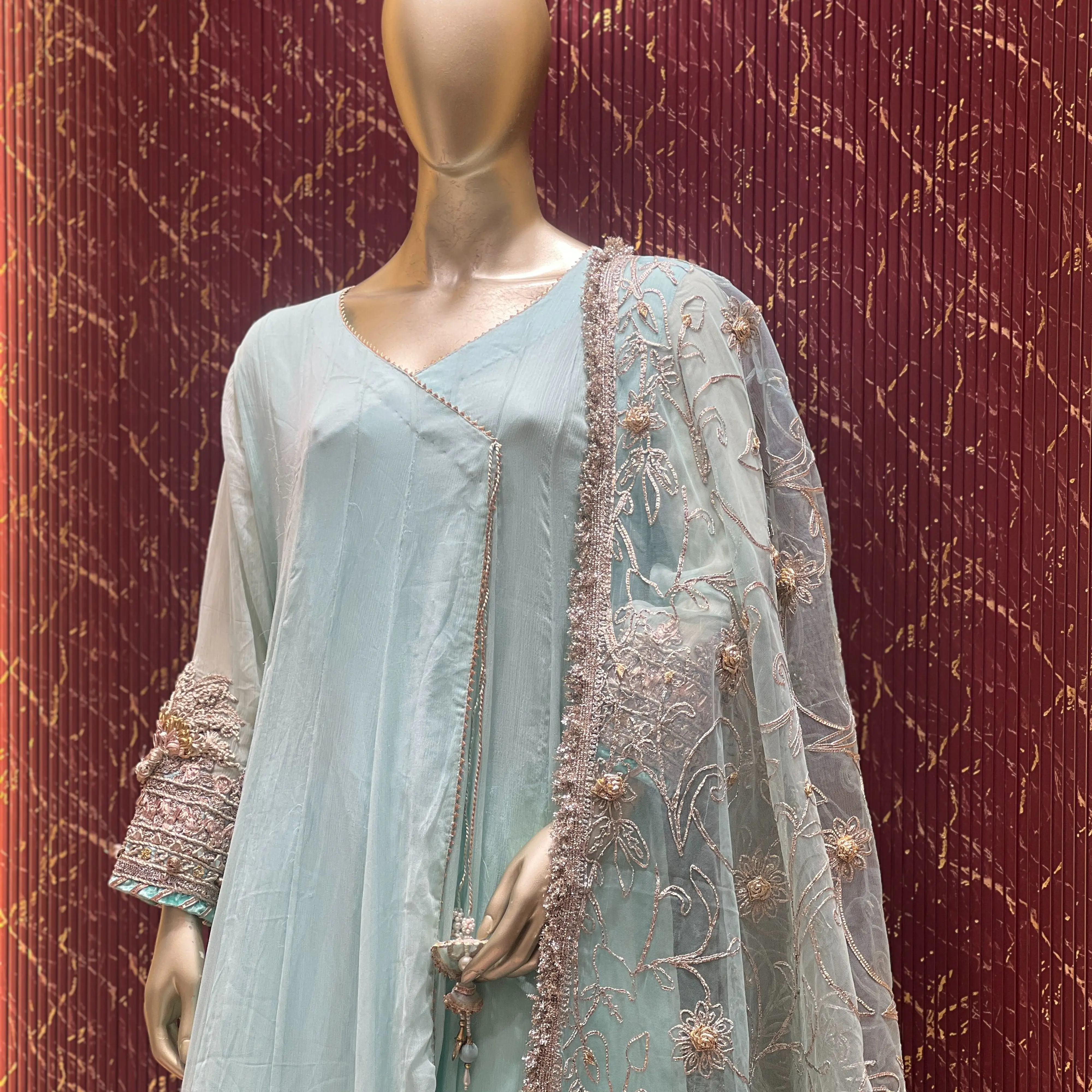 This set is perfect for women who love traditional silhouettes with a modern sense of elegance. The angrakha style drapes beautifully on the body while ensuring comfort and ease of movement.