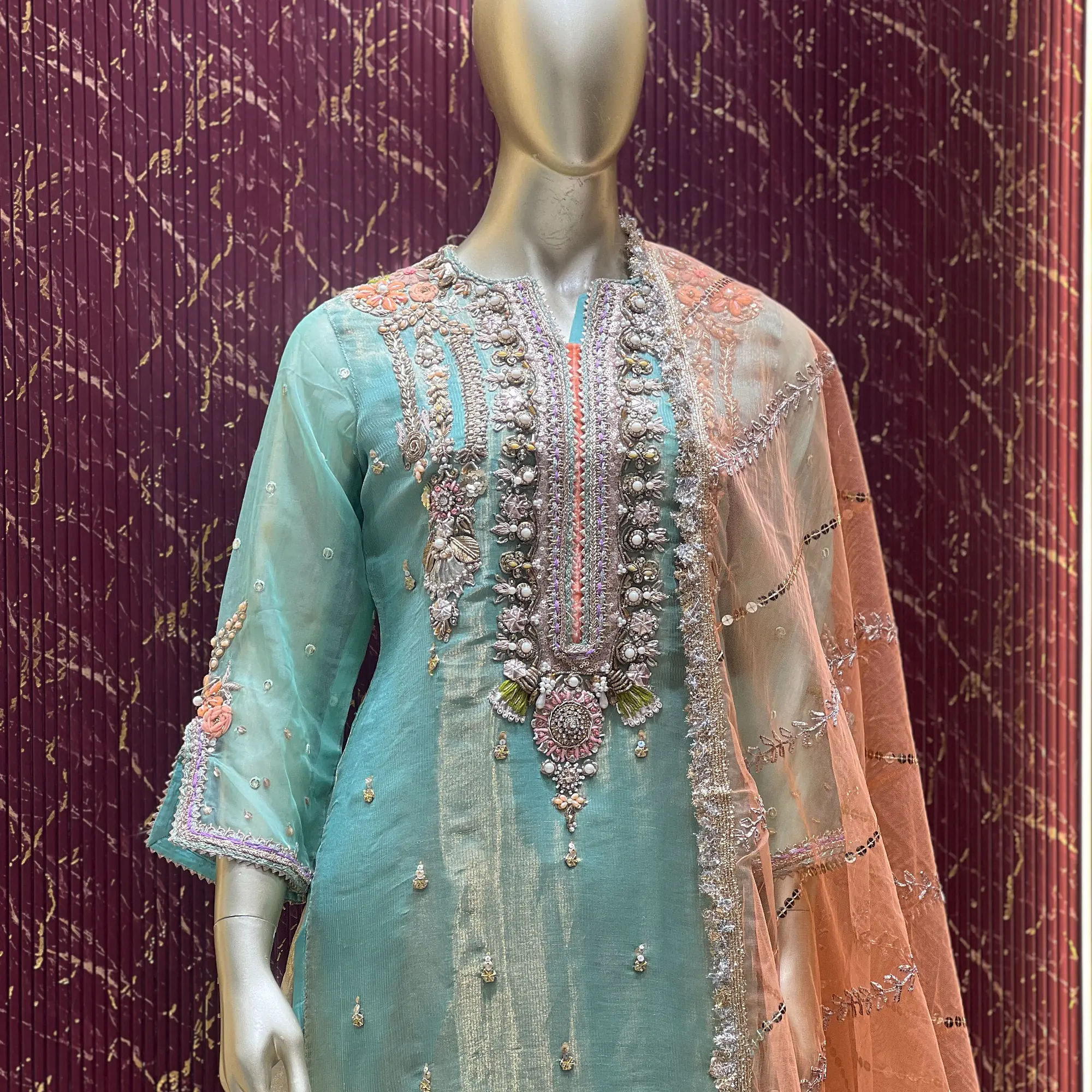 The top is crafted from Tissue fabric, adding a gentle shine that brings a festive touch to the outfit. The bottom is made from Banarasi fabric, which adds traditional richness and a royal feel. The look is completed with a net dupatta, giving the outfit a soft and graceful finish.