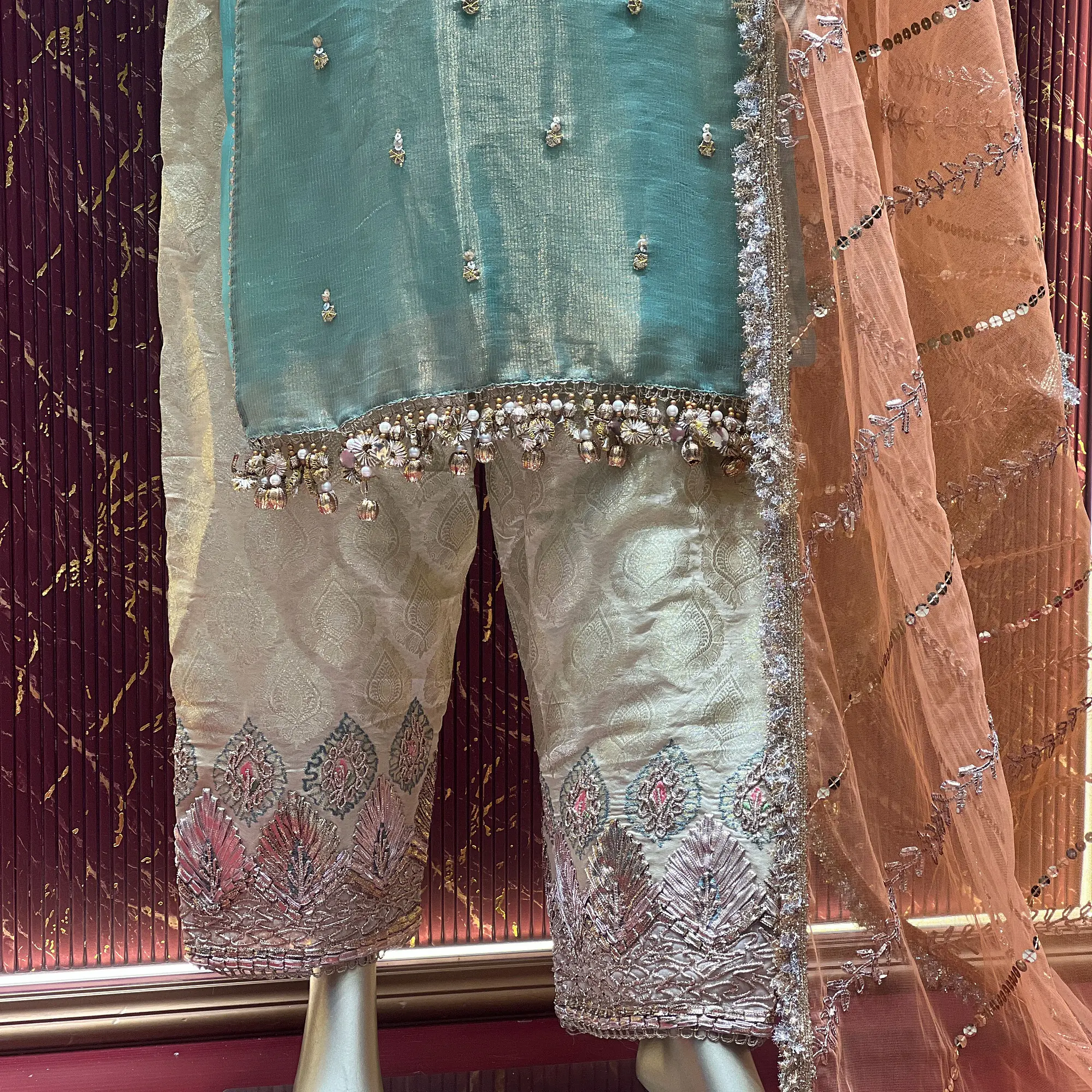 The pant-style design gives this outfit a modern silhouette, while the combination of traditional fabrics keeps it elegant and timeless. Designed for comfort, it can be worn easily throughout the day.