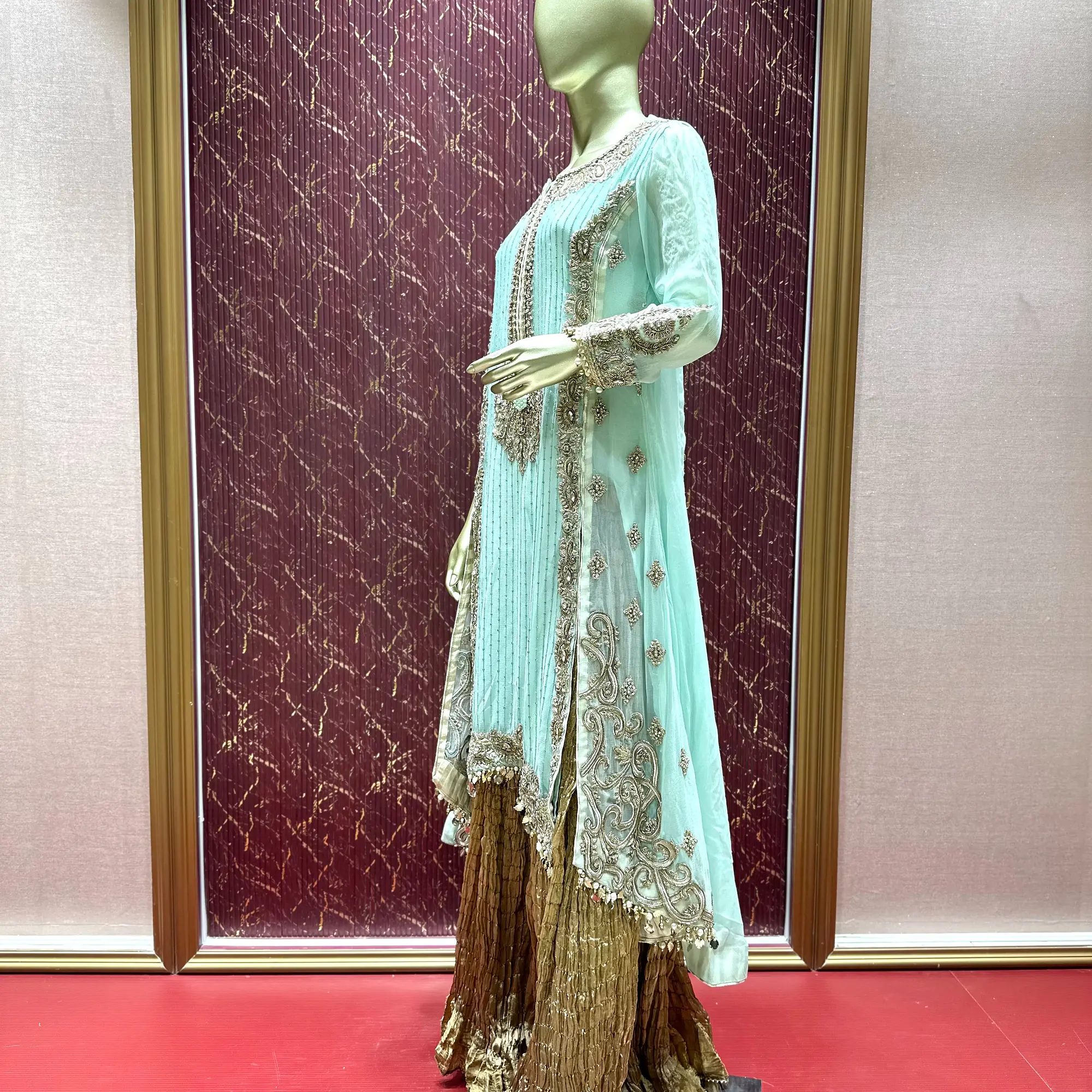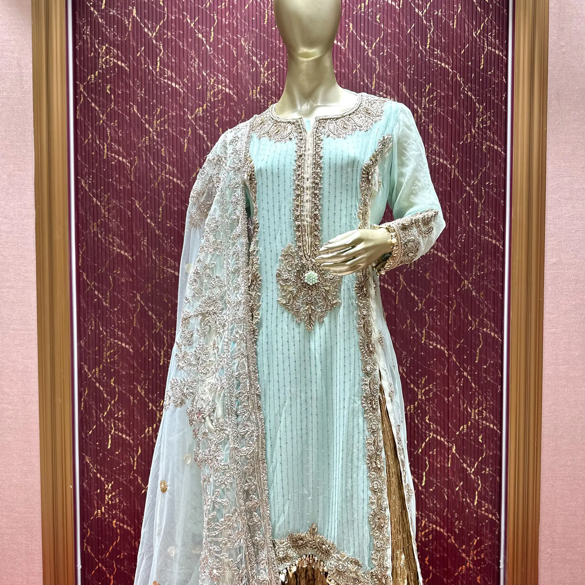 Step into timeless elegance with this Khudabaksh designer palazzo set, crafted for style and comfort. Featuring a flowy chiffon georgette top, soft crushed fabric bottoms, and a lightweight net dupatta, this ensemble blends grace with ease. A perfect choice for festive gatherings, evening occasions, or when you simply want to stand out.