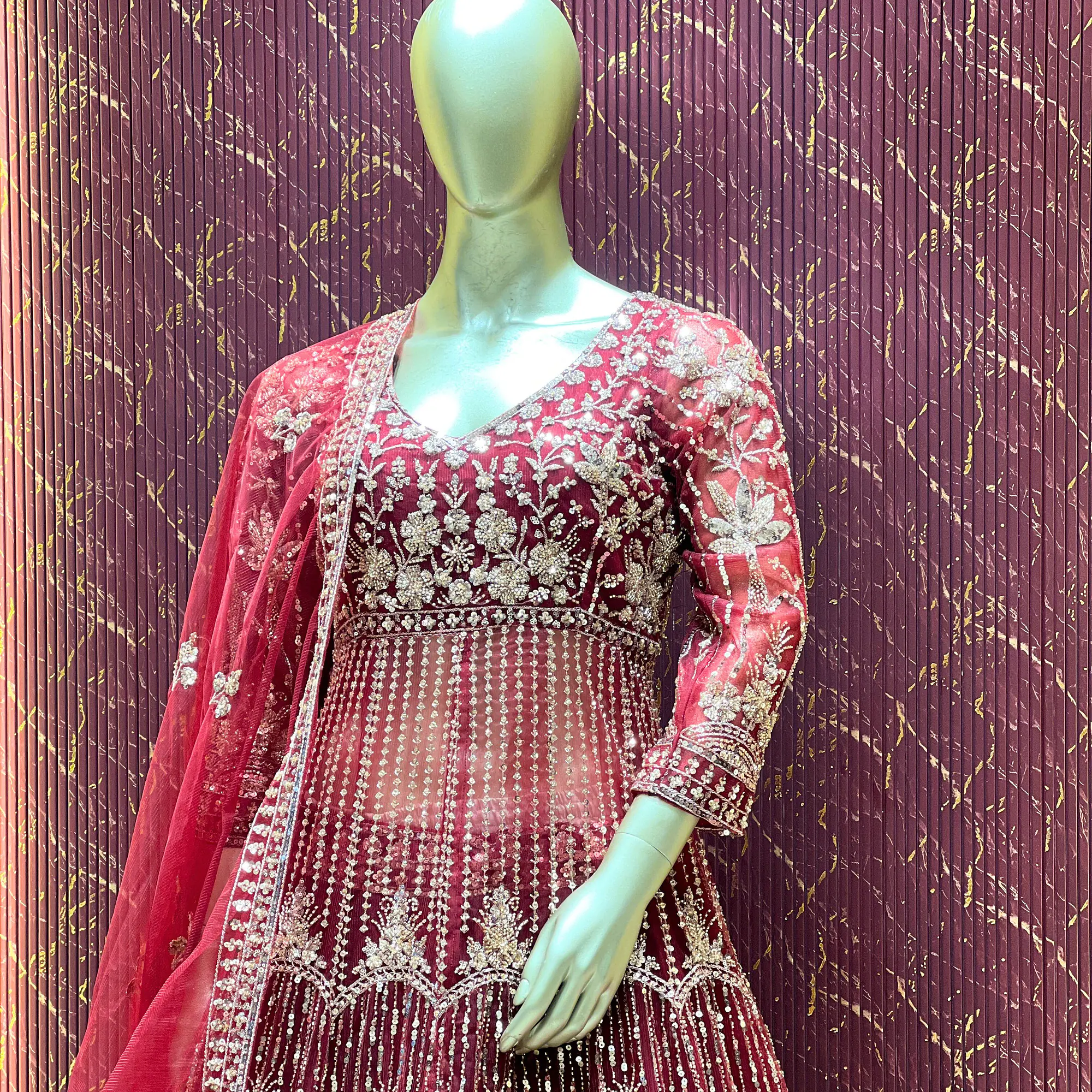 This Maroon Indo Western long frock style lehenga set offers a rich and elegant look, perfect for special occasions. Crafted from net fabric, the outfit feels soft, lightweight, and flowy, giving it a classy finish.