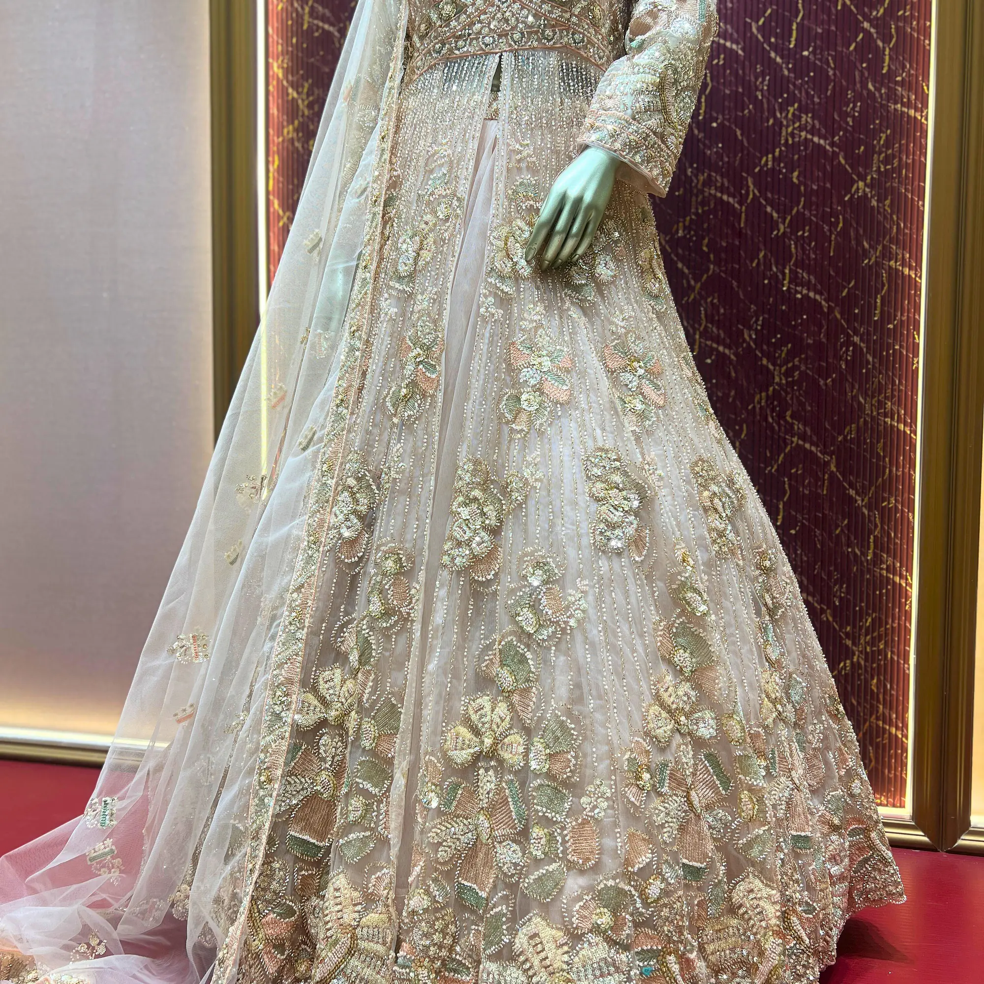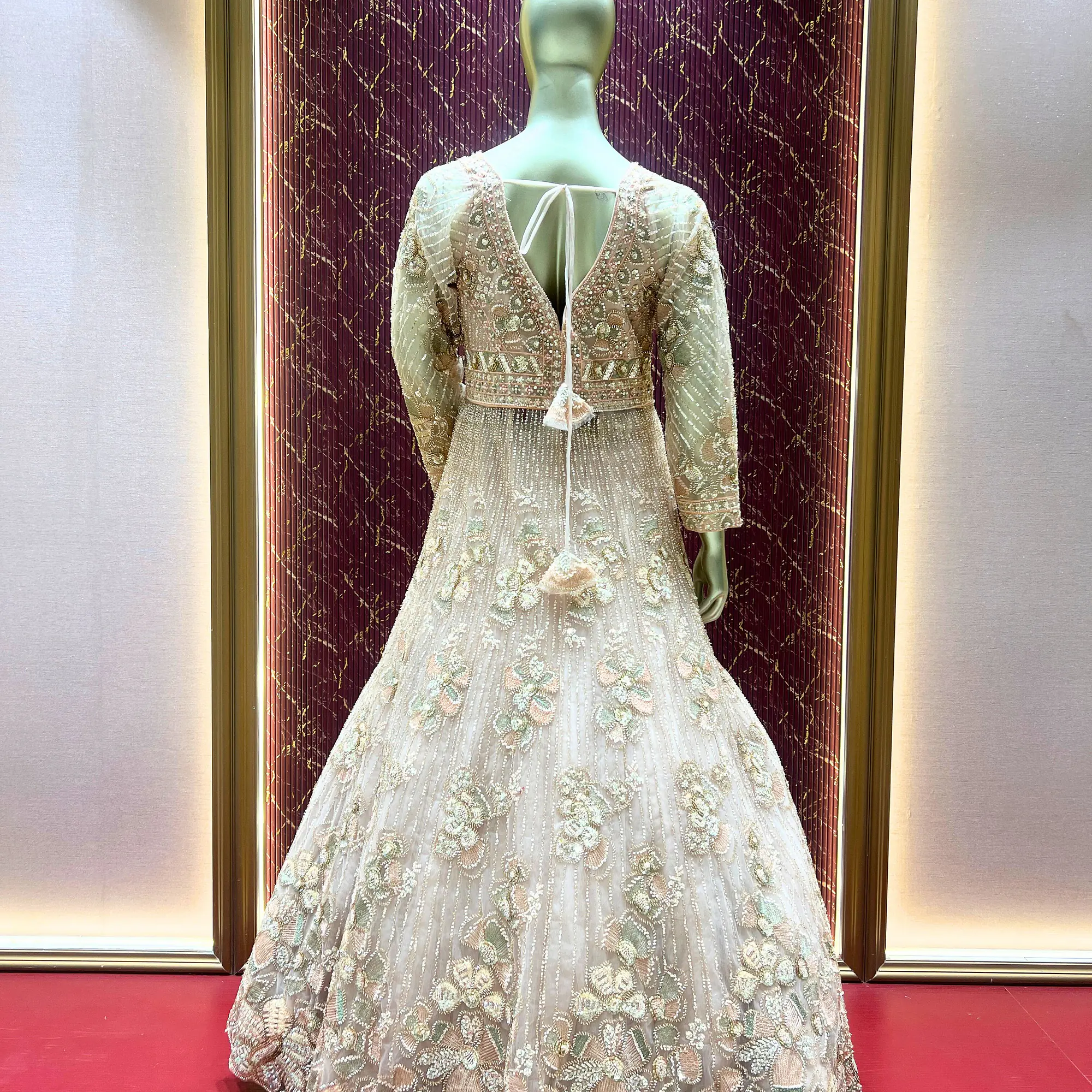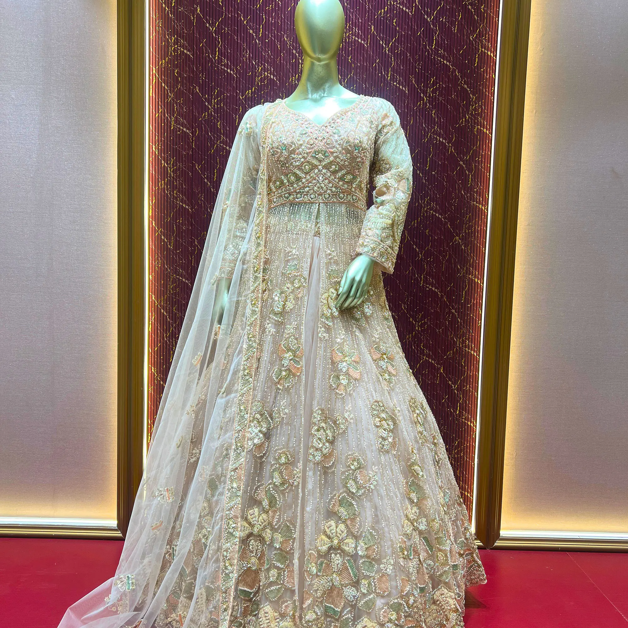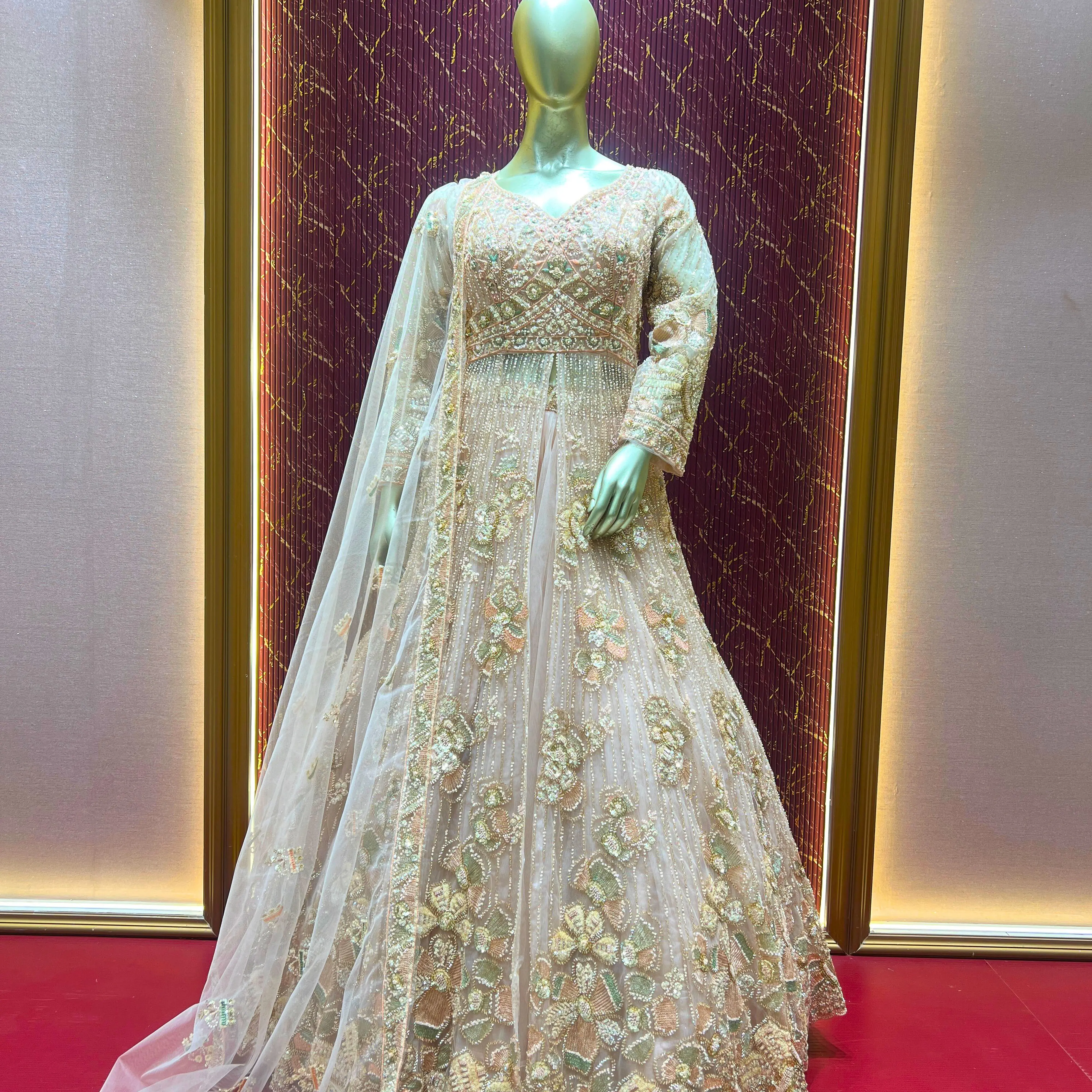 This Peach Indo Western long frock style lehenga set is a perfect blend of traditional elegance and modern design. Crafted in net fabric, the outfit offers a soft, flowy, and graceful look.
