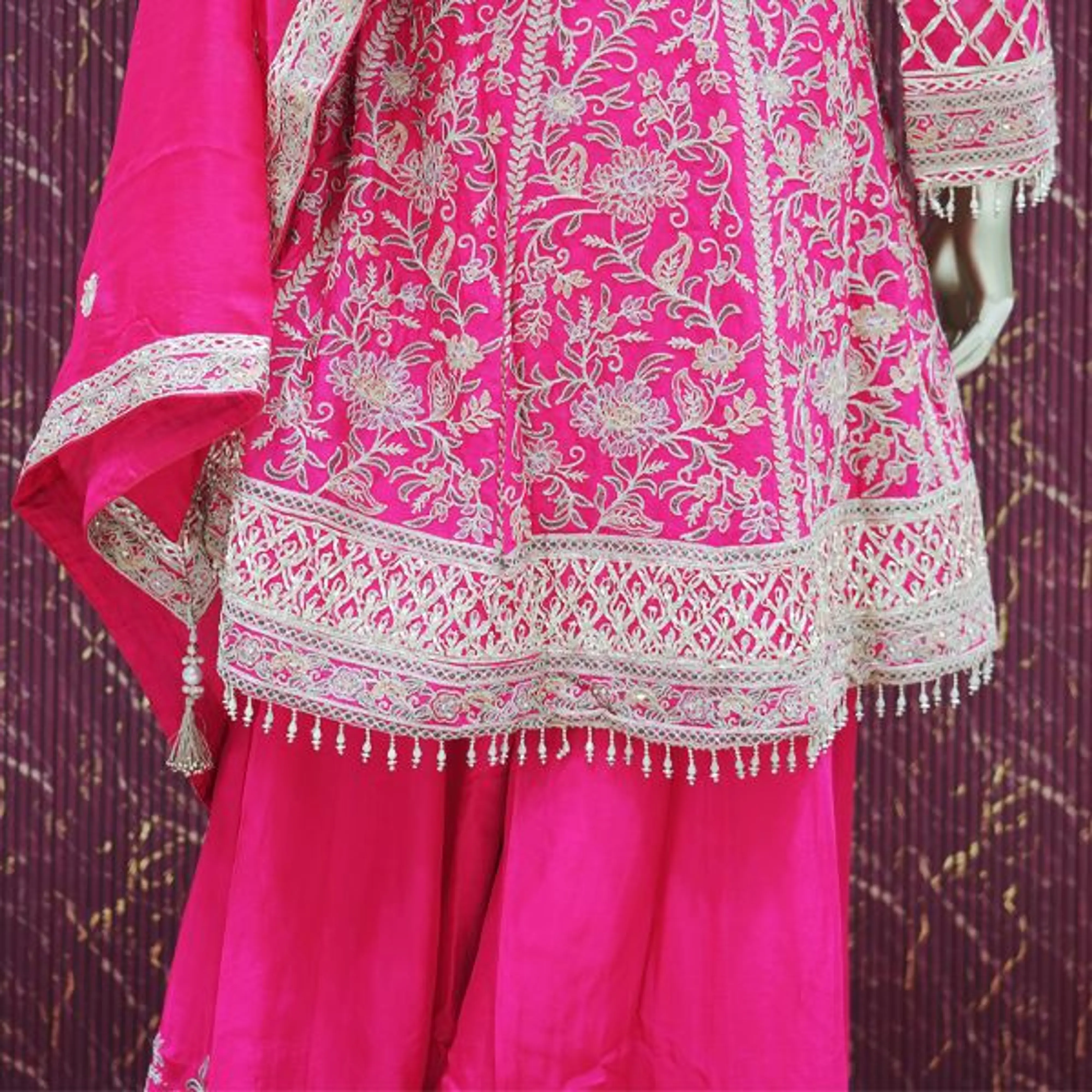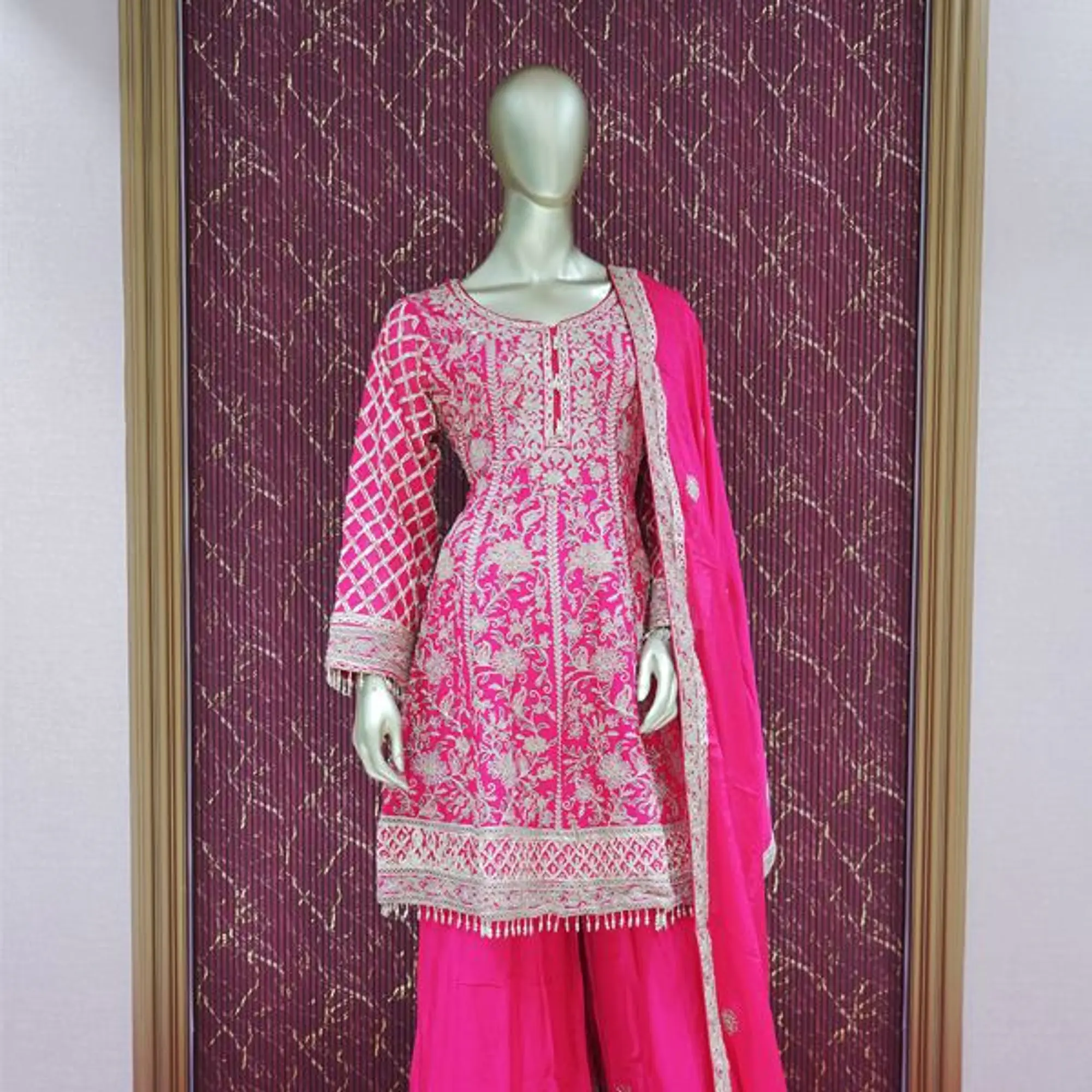 The Rani Elegance Chinon Chiffon Palazzo Set is a stylish and graceful ethnic ensemble, perfect for festive occasions and celebrations. This beautiful set includes a top, palazzo bottom, and dupatta, all crafted from premium Chinon Chiffon Plus fabric, known for its lightweight feel, soft texture, and elegant drape.