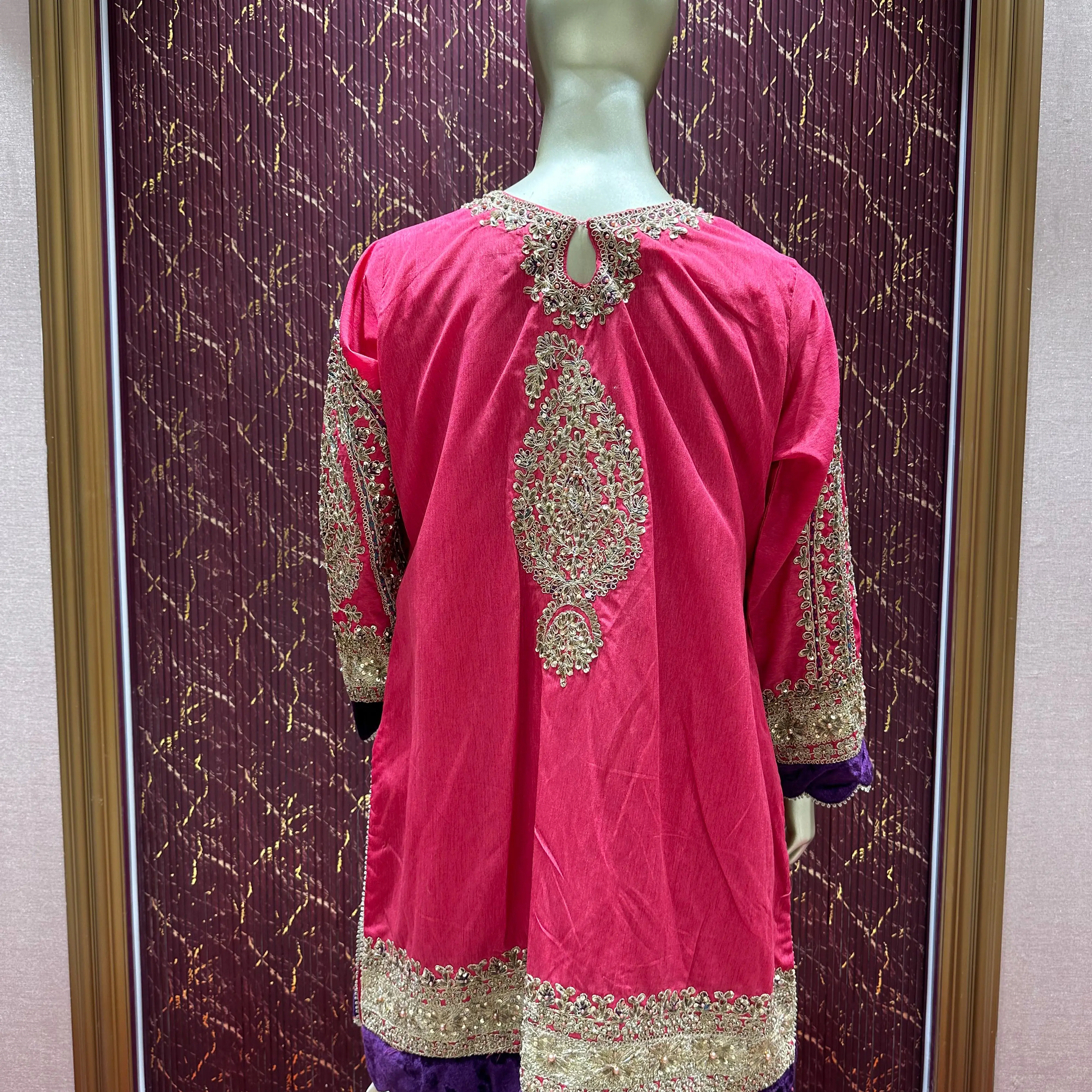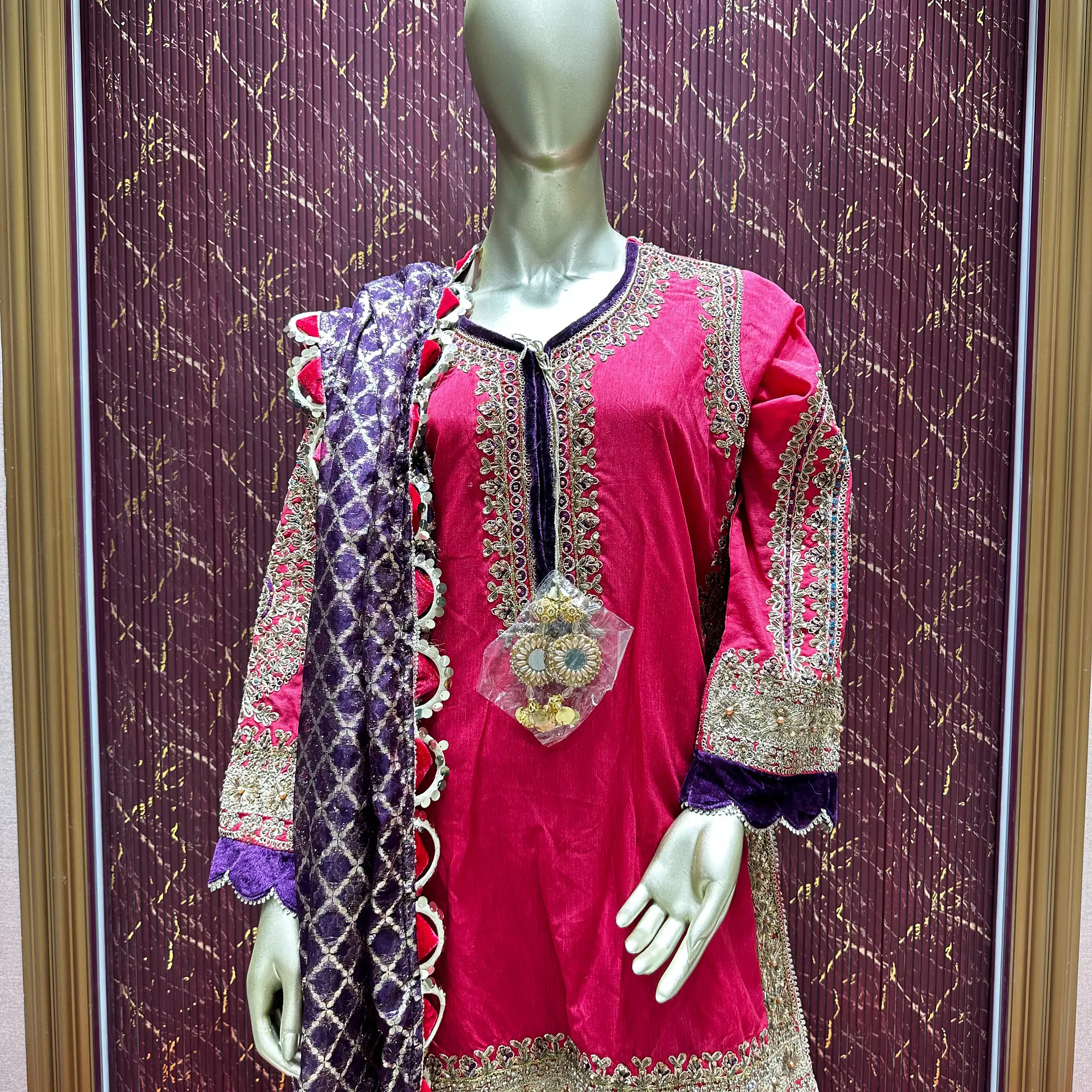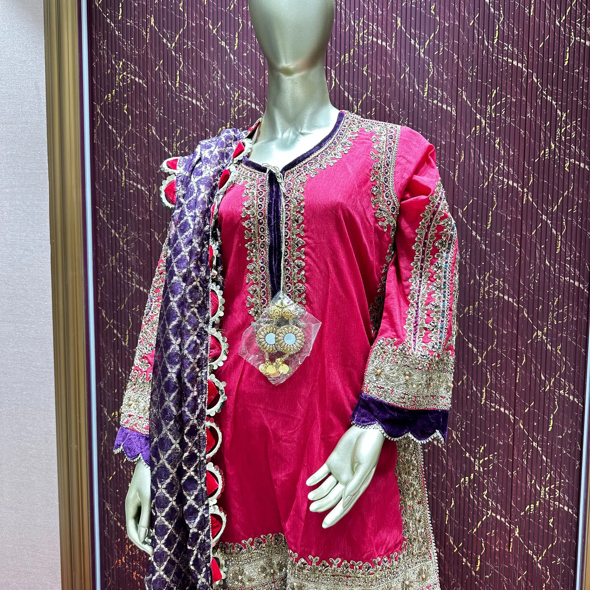 Turn heads with this beautifully crafted gharara set, featuring a raw silk top, smooth silk bottoms in traditional gharara style, and a graceful organza dupatta. The rich textures and timeless silhouette make it a perfect pick for weddings, festive events, or elegant celebrations.