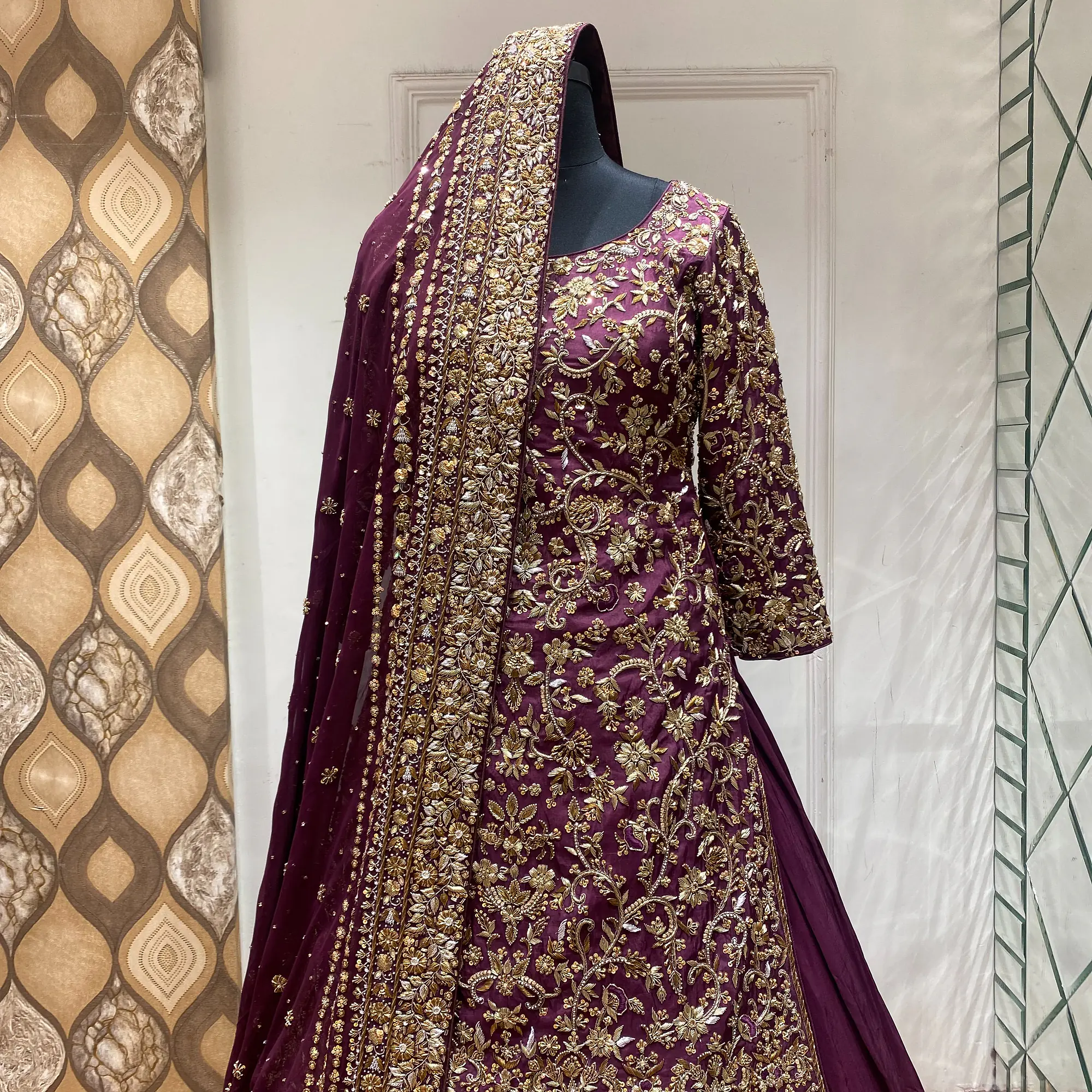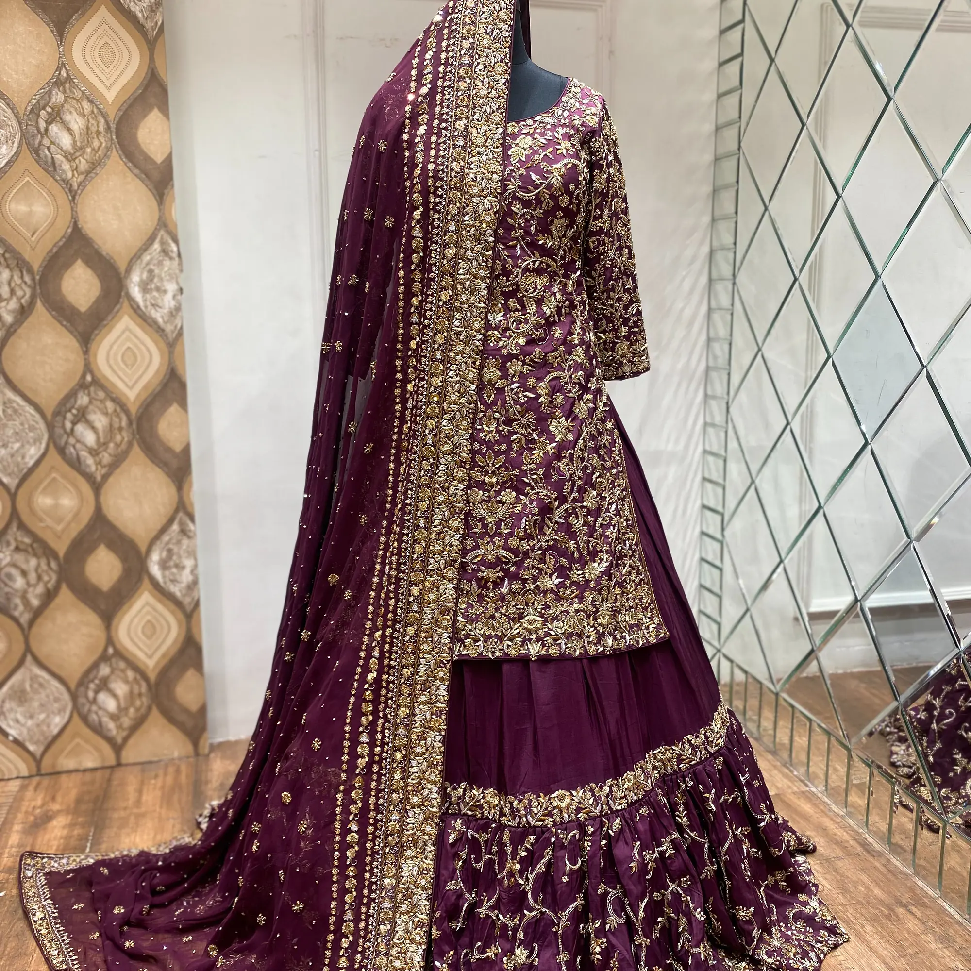 Introducing Regal Threads, an exquisite Farshi Sharara ensemble that captures the essence of royal elegance and masterful craftsmanship. This premium piece is adorned with intricate antique gold and copper zardozi embroidery, making it a true celebration of timeless tradition.