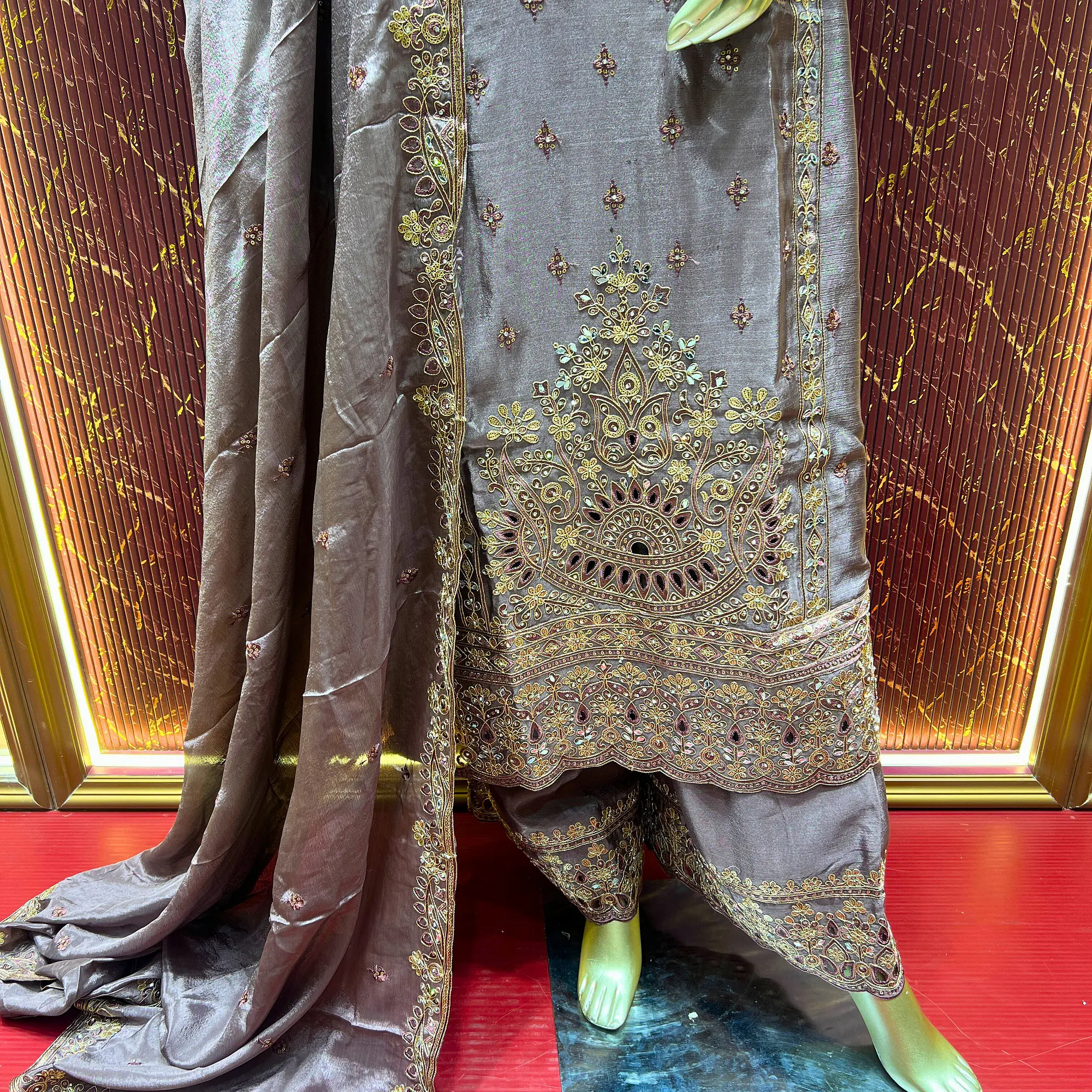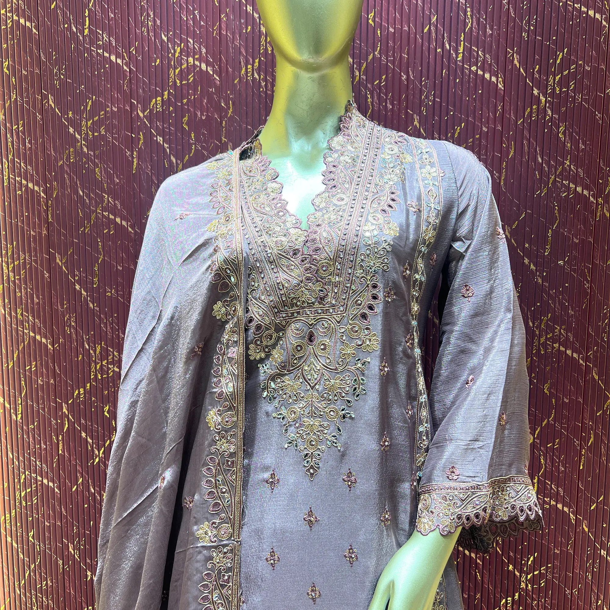 The Smokey Grey Chinon Chiffon Palazzo Suit Set is a perfect blend of elegance, comfort, and modern style. Designed in a soothing Smokey Grey shade, this outfit offers a classy and premium look suitable for various occasions.
